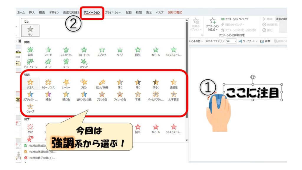 2.「アニメーション」→「強調」系を選ぶ