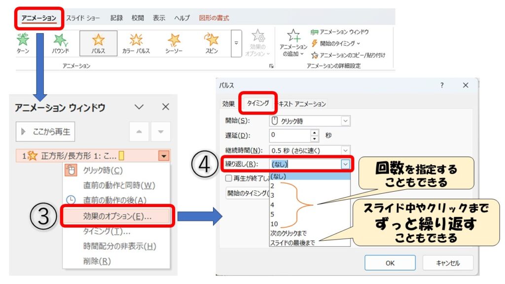 4.「タイミング」タブ の「繰り返し」を変更