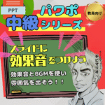 2025年9月6日 / 最終更新日時 : 2025年8月19日 チビ マリオ ☆授業☆ 【パワポ中級⑤】スライドに効果音をつける!効果音とBGMの使い分け! 「スライドに音を入れたい!」 と思っても 「効果音とBGMってどう違うの?」と 迷った経験はありませんか? ここでは両者の違いと 効果音の基本的な使い方を 紹介します ①効果音とBGMの違い 2つとも音を出すという点では […]