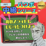 2025年9月7日 / 最終更新日時 : 2025年8月19日 チビ マリオ ☆授業☆ 【パワポ中級⑥】BGMを流し続けるスライドを作るには? プレゼン中に 雰囲気のあるBGMが流れ続けていたら… かっこいいですよね! 感動しますよね! 特定のスライドだけはもちろん、 スライドをまたいで BGMを流し続ける方法をご紹介します ①こんなときに使う 発表全体に音楽を […]